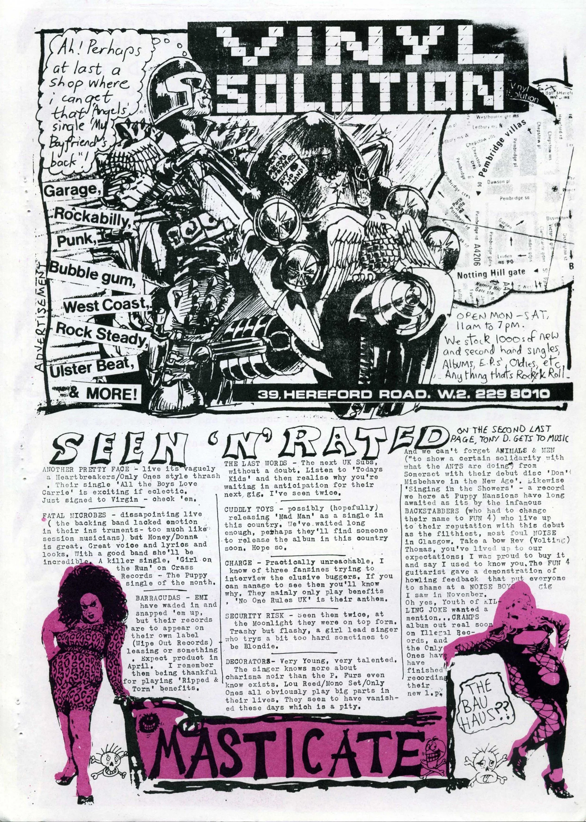 Ripped & Torn never changed its basics which was an eclectic mix of contributions, collage, comments, reviews, random thought provoking pieces and interviews in type, handwritten and DIY cut and paste. It also included gig pictures from Jem Gibbs and Walt Davidson to name two, and cartoons from Phil Smee all with complete editorial freedom. Ever popular was the readers chart, a fanzine staple but which again reflected the evolving state of punk.